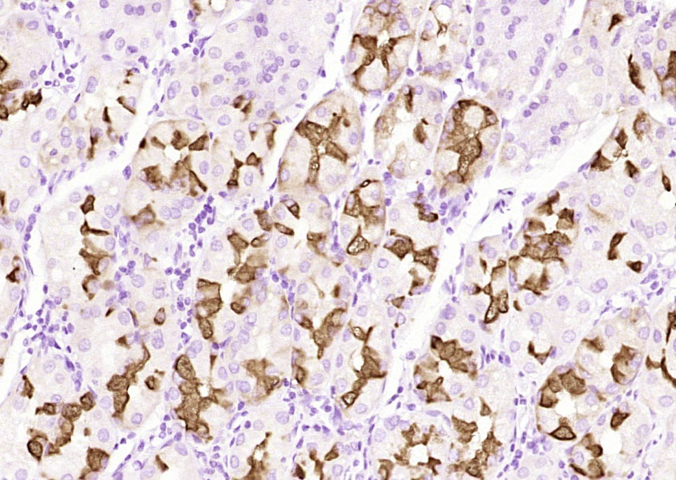 | Target/Specificity | Expressed in the regenerative zone of gastric antrum, gastric body mucosa and gastric incisura mucosa. Expressed in the deeper mucous glands of gastric antrum. Overexpressed in Helicobacter pylori infected gastric epithelium. Highly expressed in duodenal Brunner's glands, gall bladder, seminal vesicle, pancreatic centroacinar cells and ducts, and periductal glands of the common bile duct. |